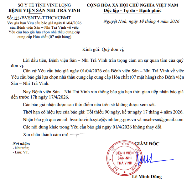 • Đính chính công văn số 20/BVSN-KDVTYT của Bệnh viện Sản – Nhi Trà Vinh ngày 07/3/2023 về việc báo giá vật tư, hoá chất, sinh phẩm chẩn đoán invitro.