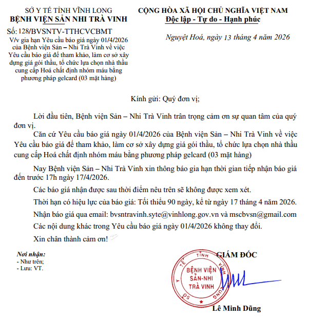 • Đính chính công văn số 20/BVSN-KDVTYT của Bệnh viện Sản – Nhi Trà Vinh ngày 07/3/2023 về việc báo giá vật tư, hoá chất, sinh phẩm chẩn đoán invitro.