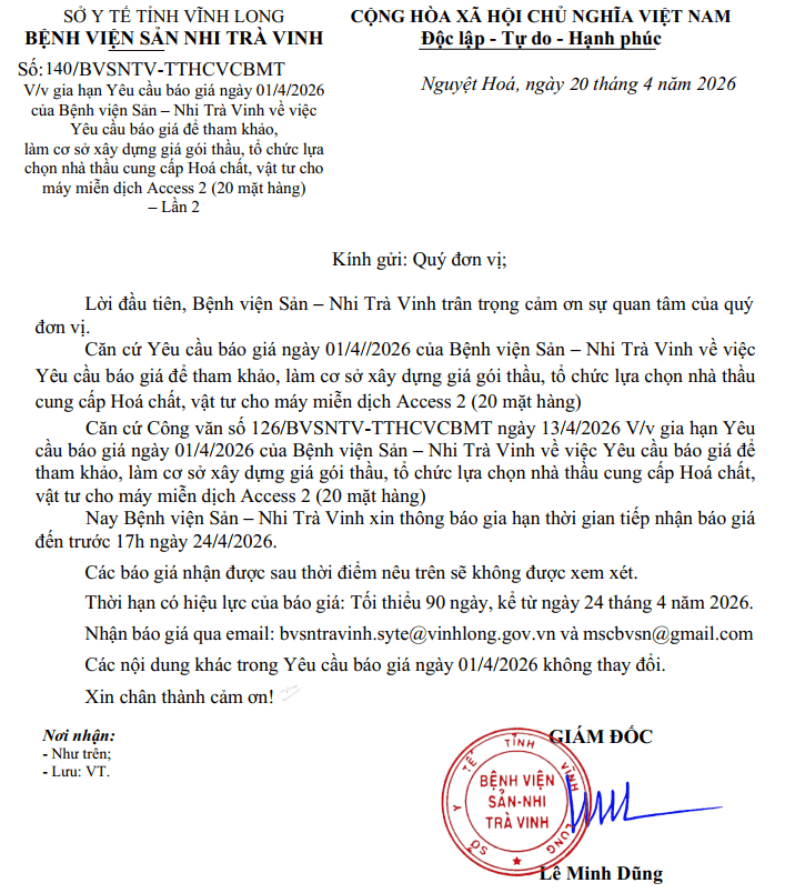 • Đính chính công văn số 20/BVSN-KDVTYT của Bệnh viện Sản – Nhi Trà Vinh ngày 07/3/2023 về việc báo giá vật tư, hoá chất, sinh phẩm chẩn đoán invitro.