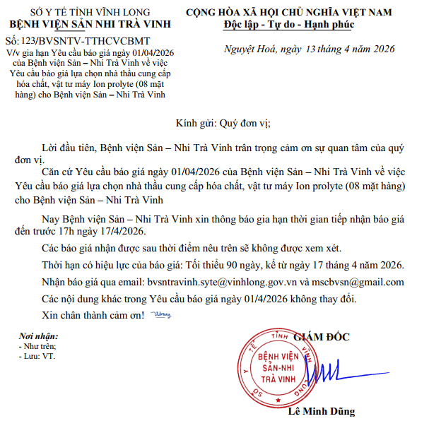 • Đính chính công văn số 20/BVSN-KDVTYT của Bệnh viện Sản – Nhi Trà Vinh ngày 07/3/2023 về việc báo giá vật tư, hoá chất, sinh phẩm chẩn đoán invitro.