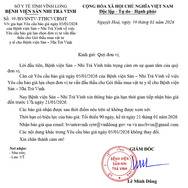 • Công văn gia hạn lần 2 Yêu cầu báo giá Mua In ấn phẩm cho Bệnh viện Sản - Nhi