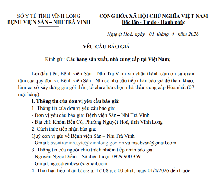 • Công văn yêu cầu báo giá gói thầu thuê xử lý chất thải y tế nguy hại của bệnh viện Sản - Nhi Trà Vinh