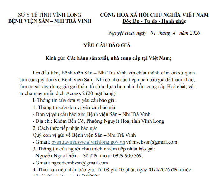 • Công văn yêu cầu báo giá gói thầu thuê xử lý chất thải y tế nguy hại của bệnh viện Sản - Nhi Trà Vinh