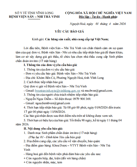 • Công văn yêu cầu báo giá gói thầu thuê xử lý chất thải y tế nguy hại của bệnh viện Sản - Nhi Trà Vinh