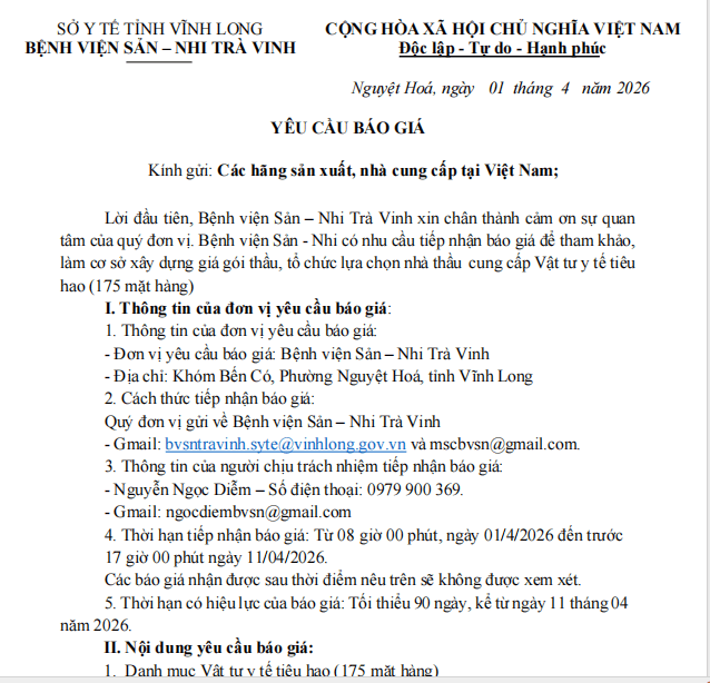 • Công văn yêu cầu báo giá gói thầu thuê xử lý chất thải y tế nguy hại của bệnh viện Sản - Nhi Trà Vinh