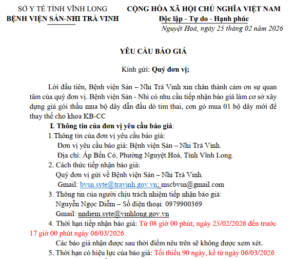 • Công văn yêu cầu báo giá gói thầu thuê xử lý chất thải y tế nguy hại của bệnh viện Sản - Nhi Trà Vinh