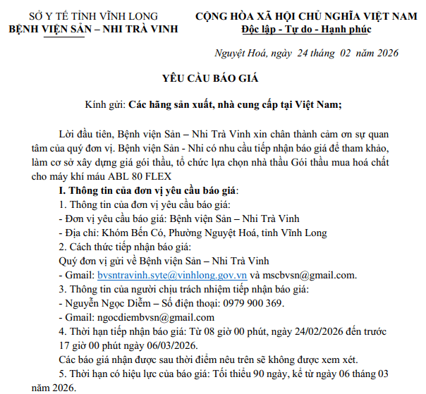 • Công văn yêu cầu báo giá gói thầu thuê xử lý chất thải y tế nguy hại của bệnh viện Sản - Nhi Trà Vinh