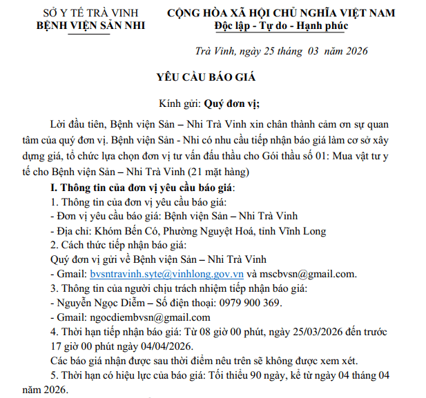 Yêu cầu báo giá lựa chọn đơn vị tư vấn gói thầu Mua vật tư y tế cho Bệnh viện Sản – Nhi Trà Vinh (21 mặt hàng)
