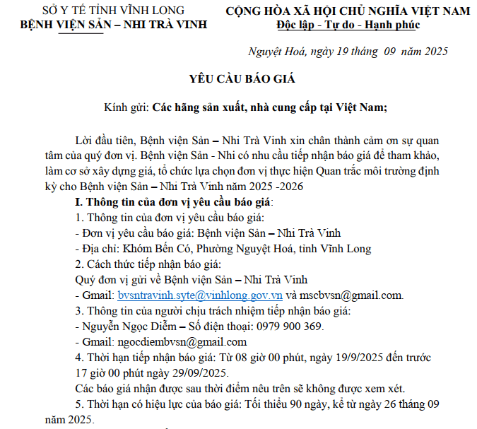 Yêu cầu báo giá gói thầu Quan trắc môi trường định kỳ cho Bệnh viện Sản – Nhi Trà Vinh năm 2025 -2026