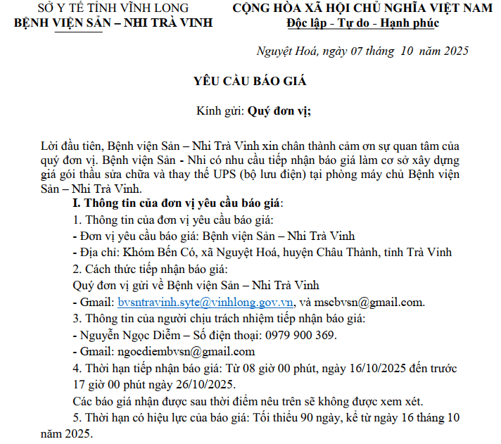 BỆNH VIỆN CHUYÊN KHOA SẢN - NHI TRÀ VINH