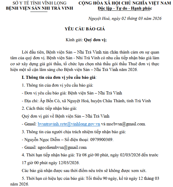 • Công văn yêu cầu báo giá gói thầu thuê xử lý chất thải y tế nguy hại của bệnh viện Sản - Nhi Trà Vinh
