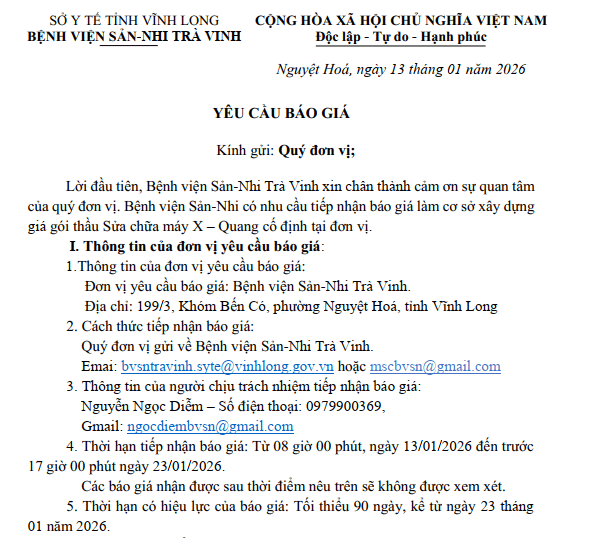 Gia hạn Yêu cầu báo giá ngày 26/11/2025 của Bệnh viện Sản – Nhi Trà Vinh về việc Yêu cầu báo giá cho gói thầu Quan trắc môi trường định kỳ cho Bệnh viện Sản – Nhi Trà Vinh năm 2025 -2026