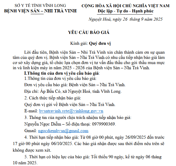 • Công văn gia hạn lần 2 Yêu cầu báo giá Mua In ấn phẩm cho Bệnh viện Sản - Nhi