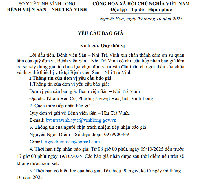 Yêu cầu báo giá gói thầu Quan trắc môi trường định kỳ cho Bệnh viện Sản – Nhi Trà Vinh năm 2025 -2026